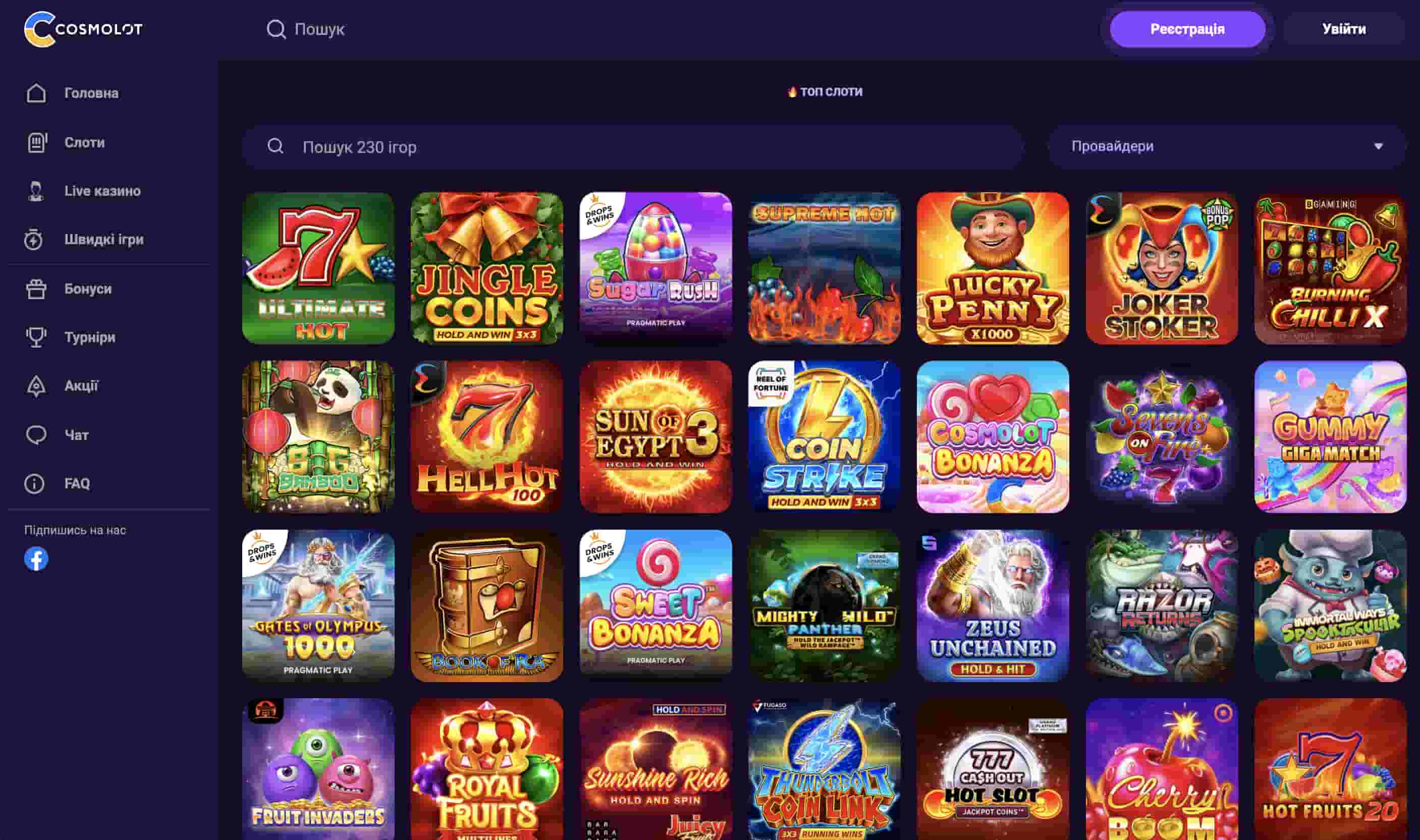 Cosmolot – це одне з найпопулярніших сучасних онлайн-казино, яке приваблює гравців яскравим дизайном, щедрими бонусами та можливістю грати на гривні. Якщо ви шукаєте надійне місце для азартних ігор з ліцензією та широким вибором розваг, Космолот стане відмінним вибором.
